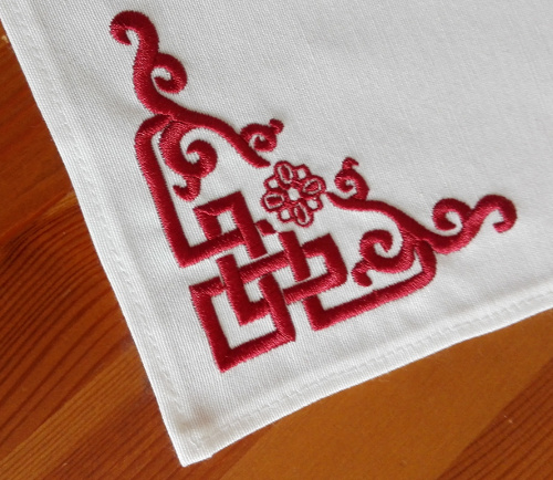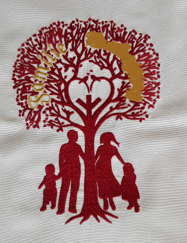 Dies ist eine hochwertige Tischdecke aus 75% Baumwolle 25 % Polyester. Sie trägt das Motiv eines Baumes mit dem Sippennamen und eines Paares in der Mitte, in den Ecken befindet sich ein Knotenmotiv. (Abbildung ähnlich)